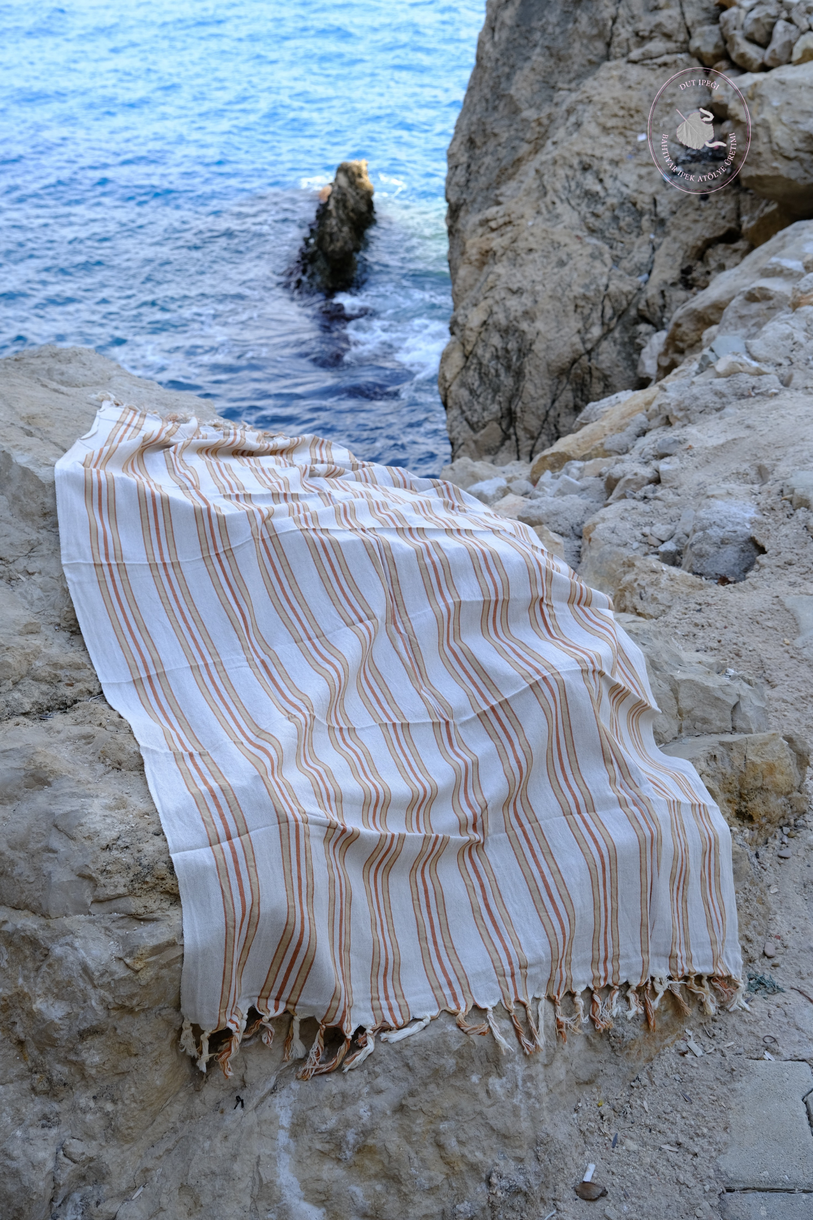 Krem Kalın Kahve Çizgili Keten Peştemal  Bahtiyar İpek Peştemal