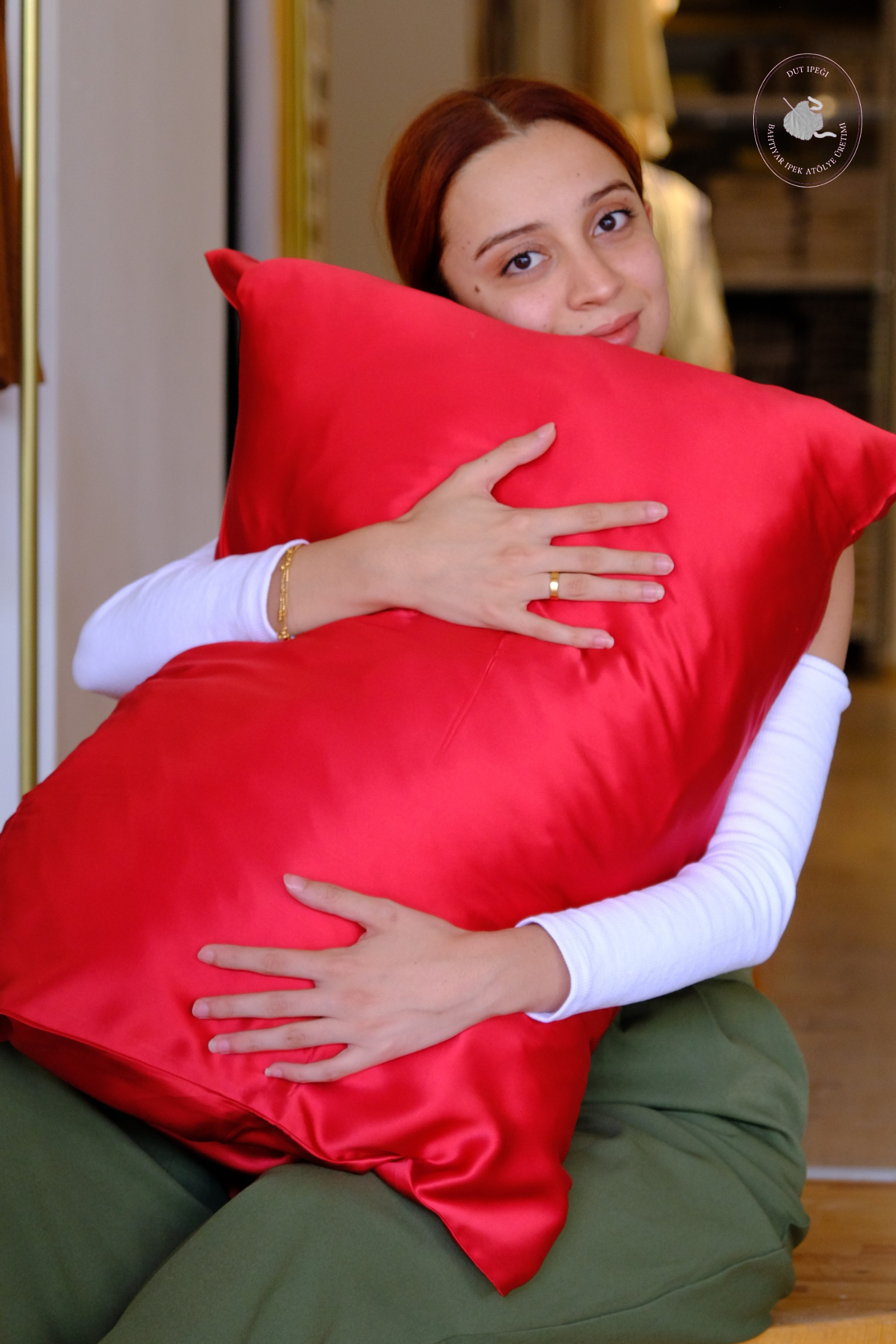 • %100 doğal ipekten üretilmiş kırmızı yastık kılıfı.