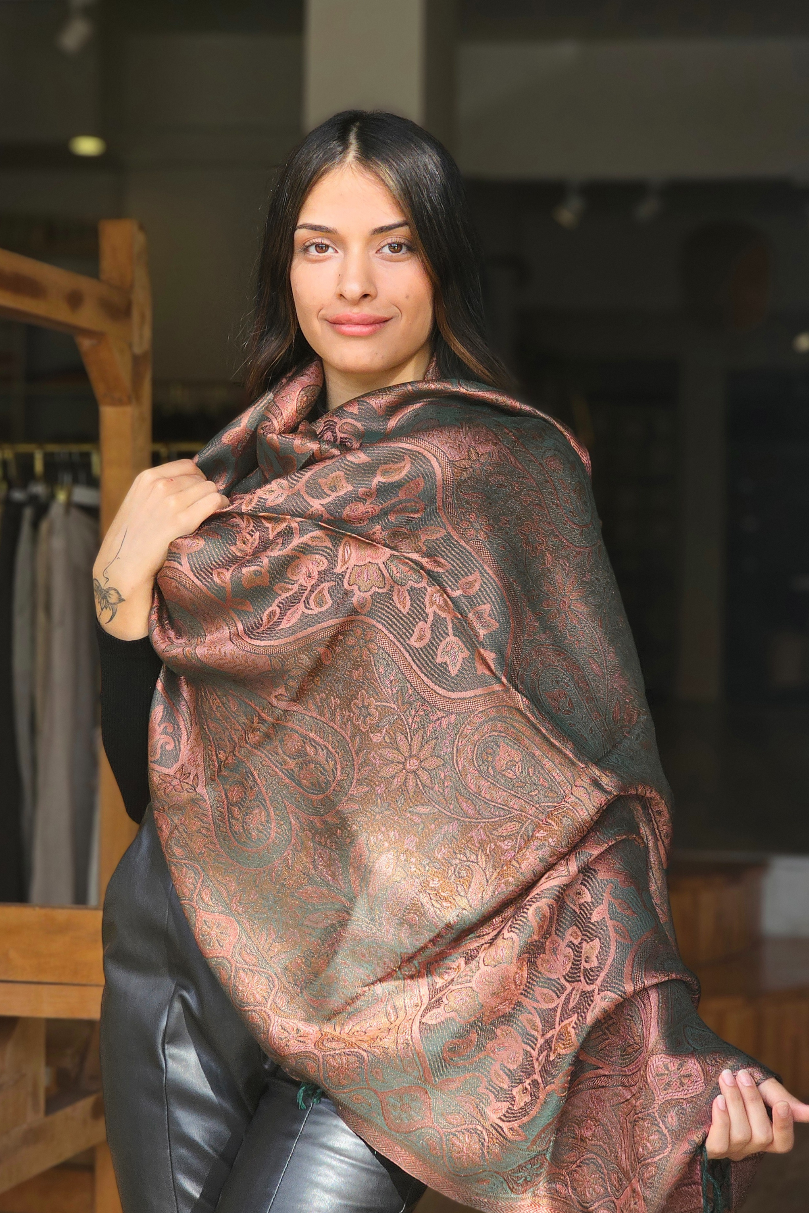 Yeşil Kiremit Jakarlı İpek Baş Örtüsü Şal (jkrb2)